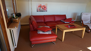 Das Wohnzimmer nimmt einen großen Teil der Wohnung ein und bietet somit viel Platz zum Entspannen. Ausgestattet mit einer großen Eckcouch, einem Lesesessel, einem LCD-TV mit DVD sowie einem Essbereich, bleiben fast keine Wünsche offen.