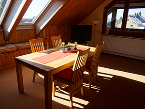 Der Essbereich im Wohnzimmer bietet ausreichend Platz für die Mahlzeiten und ist auch für spannende Spieleabende sehr gut geeignet.